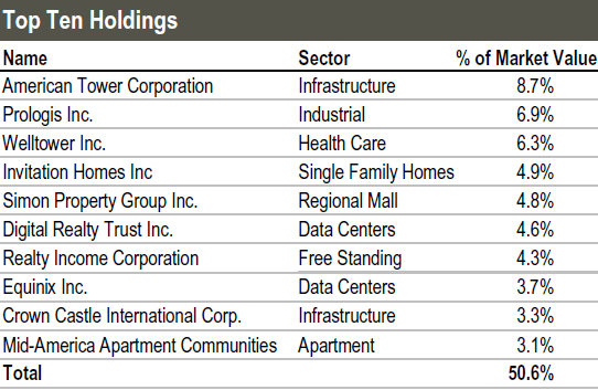 This is an income investor-friendly industry, and we seek high yields amidst discounted prices. And it helps if we can get diversified access to the entire sector. Cohen & Steers Quality Income Realty Fund, Inc. (RQI) is a CEF with 186 REIT holdings, with its top 10 portfolio constituents representing 50% of the market value. These are some of the highly-rated operators with excellent operational resilience and balance sheet quality. Source
