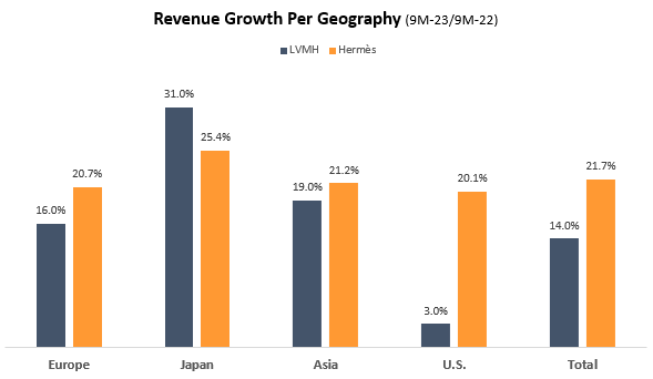Digging into the specific geographies, we see a huge gap between Hermès and LVMH in the U.S., which is clearly one of the most important geographies in terms of profitability, although the geographic profitability gap for those luxury giants is not similar to what you’re used to seeing in other industries. Still, the U.S. is extremely important. And in the U.S., Hermès outgrew LVMH by 17.1 points.