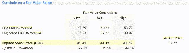 The LTM EBITDA method suggests an implied stock price range of $47.59 to $53.72, whereas the projected EBITDA method suggests a more conservative range of $35.23 to $40.07. Averaging these methods gives a fair value stock price range of $41.41 to $46.89, representing an upside of 27.2% to 44.1% from the current market price of $32.55.