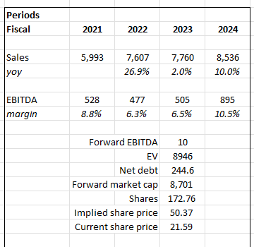 Based on my view of the business, HelloFresh should have no issues accelerating its growth rate beyond FY23. That said, I am adjusting my growth expectations modestly downward from my previous expectations due to management’s weak guidance for a low-single-digit decline in US active customers. My expectation for EBITDA margin remains the same, as I expect growth acceleration to continue driving profits upward, especially as management continues to optimize fulfillment costs. My last valuation for HFG was that it deserves to trade at 10x forward EBITDA, as I expected adjusted EBITDA to grow with the acceleration in revenue, and my expectations remain the same. My 10x forward EBITDA outlook is largely anchored upon the stock’s historically trading average. Post-FY21 (FY20 and 21 were largely influenced by the COVID situation), the stock traded at around mid- to high-single-digit forward EBITDA, with declining revenue growth. With my expectation that growth should accelerate, I expect multiples to start inflecting back to the higher end of this range.